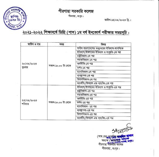 2021-2022 সালের ডিগ্রী প্রথমবর্ষের ইনকোর্স পরীক্ষার সময়সূচি
